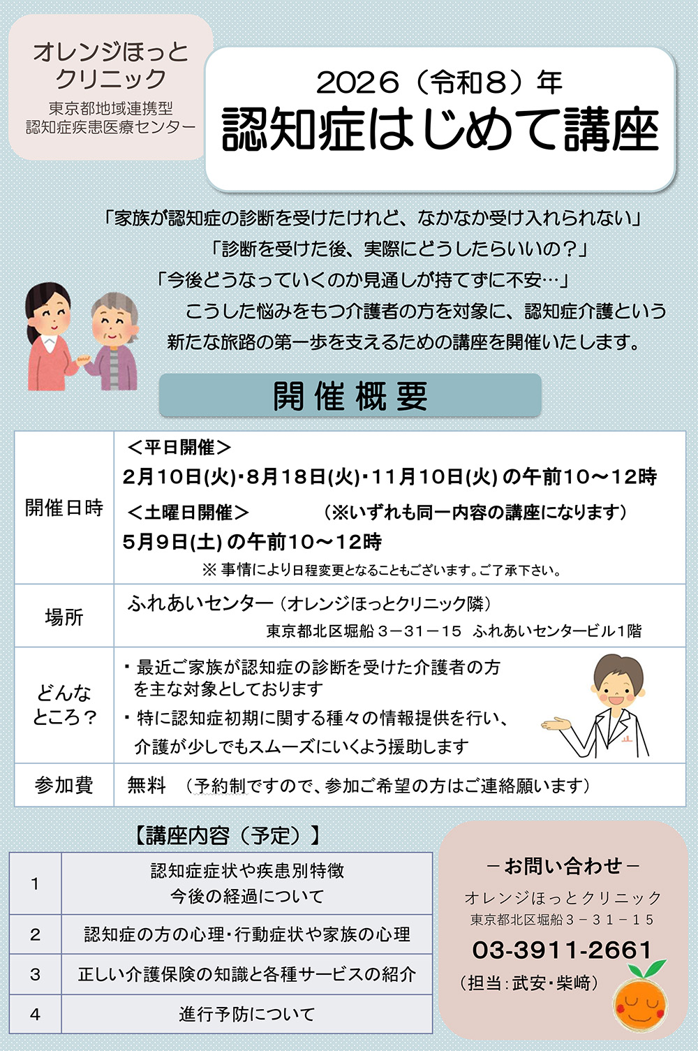 オレンジほっとクリニックでは、最近認知症と診断されたご家族がいらっしゃる介護者を対象に、認知症を正しく理解するための講座を開催しております。
